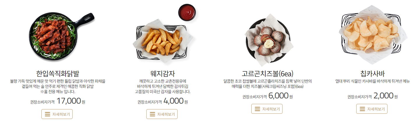 | 교촌오리지날 | 314 | 920 | 19,000 | 웨지감자 / 허니순살 |