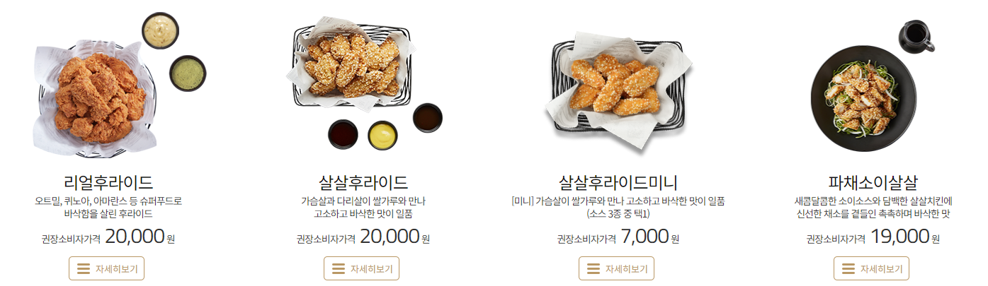 다음은 후라이드 시리즈입니다. 리얼후라이드는 닭의 모든 부위가 들어간거 같고 살살후라이드는 가슴살과 다리살만 있나봐요. 살살후라이드 미니는 가슴살로만 만들어진듯 합니다. 파채소이살살은 살살치킨에 신선한 채소가 곁들여졌다는것!! 살살후라이드 미니는 같이 먹을 추천메뉴가 안 나와있네요. 그도 그럴것이 양이 적어 이 살살후라이드미니가 다른 메뉴에 추가로 시켜야 하지 않을까 싶습니다. 그리고 확실히 후라이드가 칼로리가 전체적으로 낮은 편이네요.