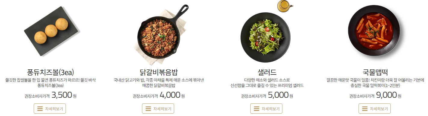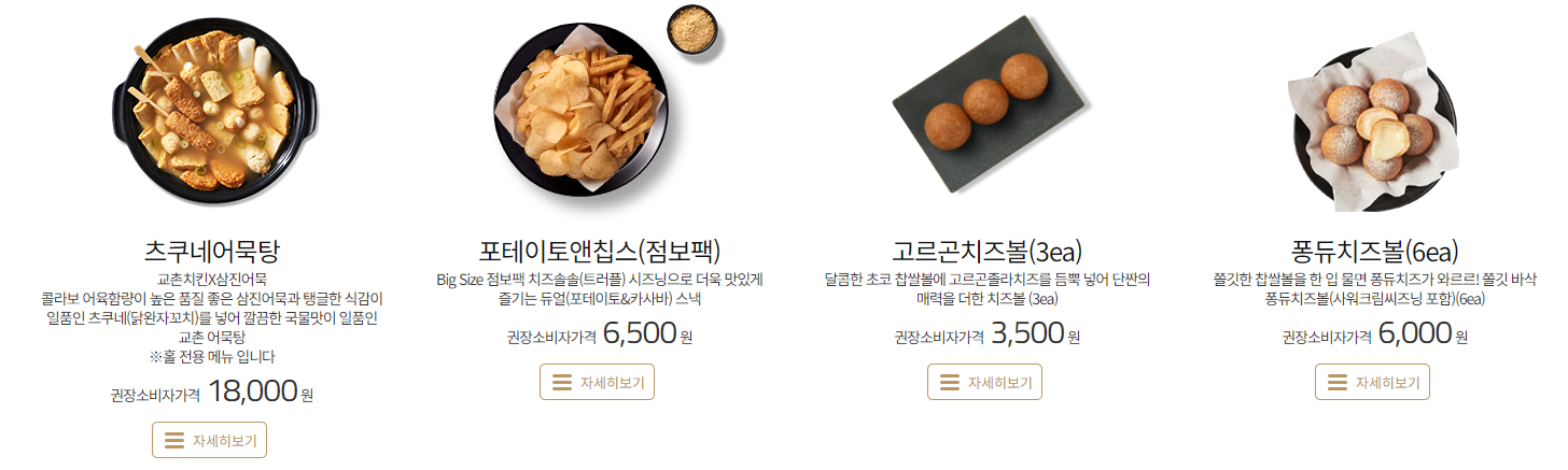 | 교촌스틱 | 272 | 920 | 22,000 | 퐁듀치즈볼 / 포테이토앤칩 |