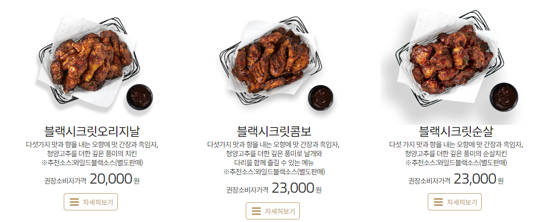 블랙시크릿은 다섯가지 맛과 향을 내는 오향에 맛 간장과 흑임자, 청양고추를 더한 깊은 풍미의 치킨이라고 합니다. 콤보는 날개와 다리로 이루어진 메뉴입니다. 블랙시크릿에 추천소스는 와일드 블랙소스라고 하는데 이건 별도판매네요. 조리전 중량이 표시되어 있는데 조리과정에서 기름기와 수분이 빠져나가 조리후 중량차이가 발생한다고 나와있습니다.