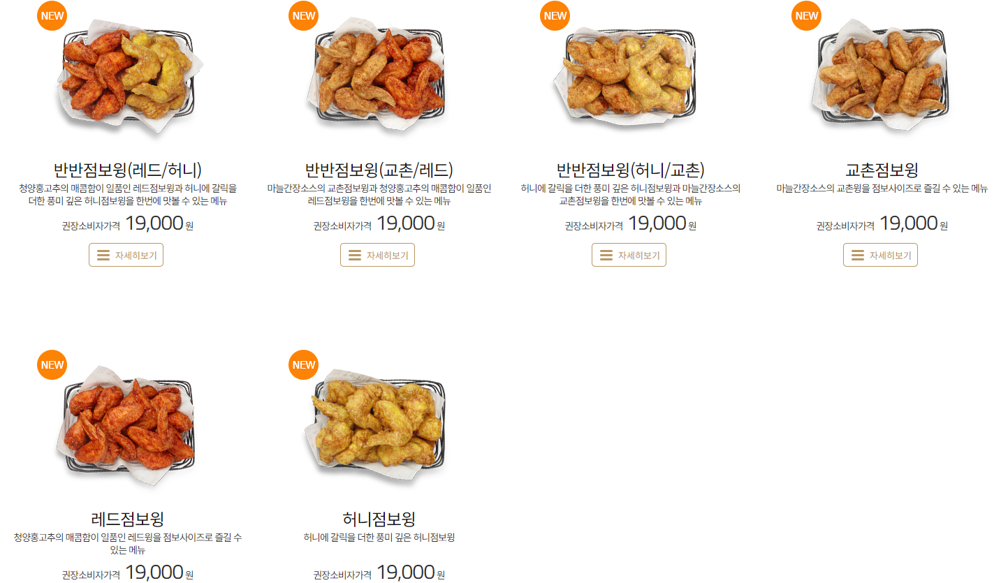먼저 점보윙시리즈입니다. 점보윙이다보니 부위는 날개이구요. 가격은 모두 19000원입니다. 홈페이지상에 들어가서보니 권장소비자가격이 19,000원이고 매장마다 판매가격이 상이할 수 있다고 나오네요^^;;; 가격이 다를수도 있을것 같으니 참고하시기 바랍니다.