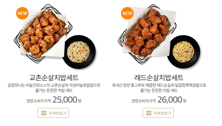 | 교촌순살치밥세트 | 교촌순살 395 의성마늘볶음밥 199.4 |